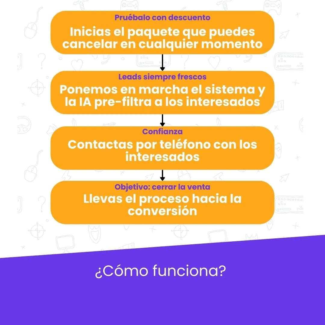 Olvídate del marketing, de la redacción de textos o de las campañas publicitarias. Tú recibes leads constantemente — solo tienes que contactar con ellos y cerrar el proceso.